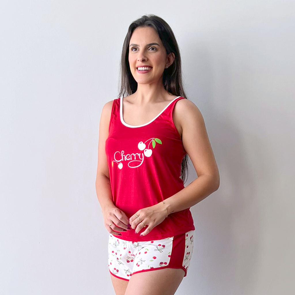 Encante-se com o charme irresistível do Pijama Feminino Curto Cherry, perfeito para quem ama combinar conforto com um toque de diversão.